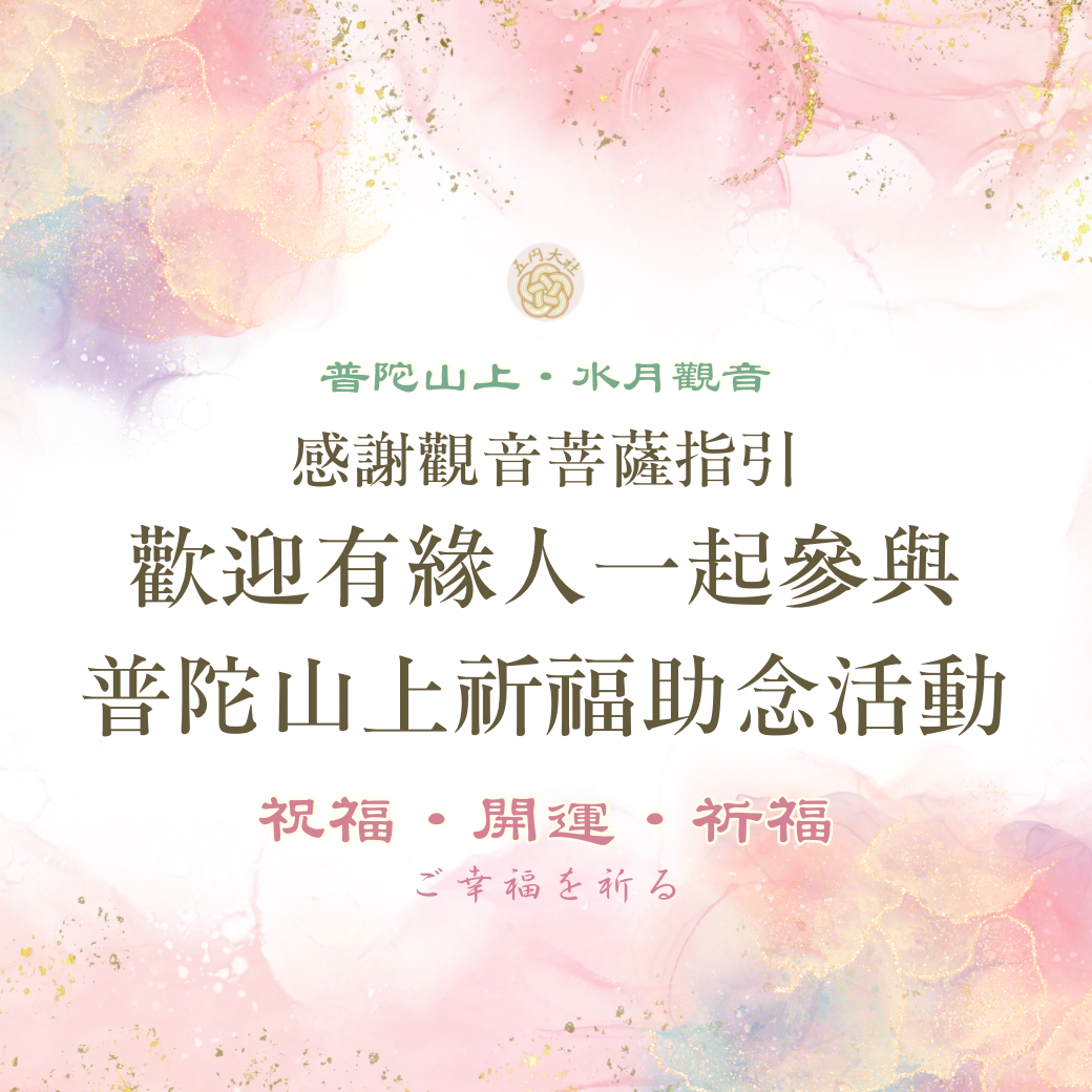為此因緣,普陀山上特別連結印度南海觀世音菩薩,為有緣朋友或其親友祈福唱名於觀音菩薩之前,希望能獲得觀音大悲力之加持護守,得到離諸人間多種怖畏煩惱、憂愁繫念的解除,並與觀世音菩薩共結善緣,一起同發大菩提心。
